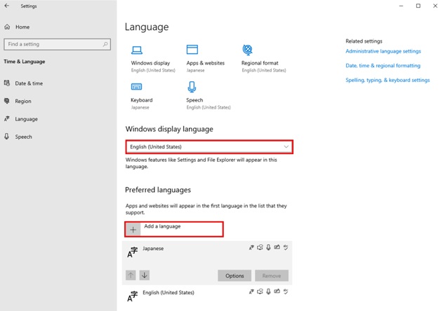 設定のWindows Setting >>Time&Languageより、日本語パックをダウンロードし、表示言語を日本語にしましょう。