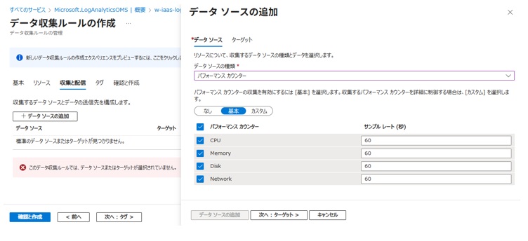「次へ:ターゲット>」を押下し、パフォーマンスカウンターをどこに保存するのか、ここではLog Analyticsワークスペースに送信されるように構成したいので、ターゲットの種類を「Azure Monitor Logs = Log Analytics」に設定します。